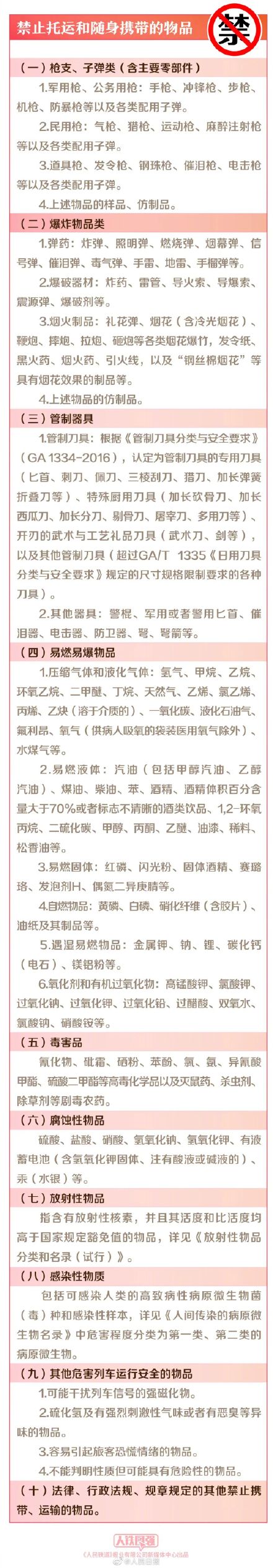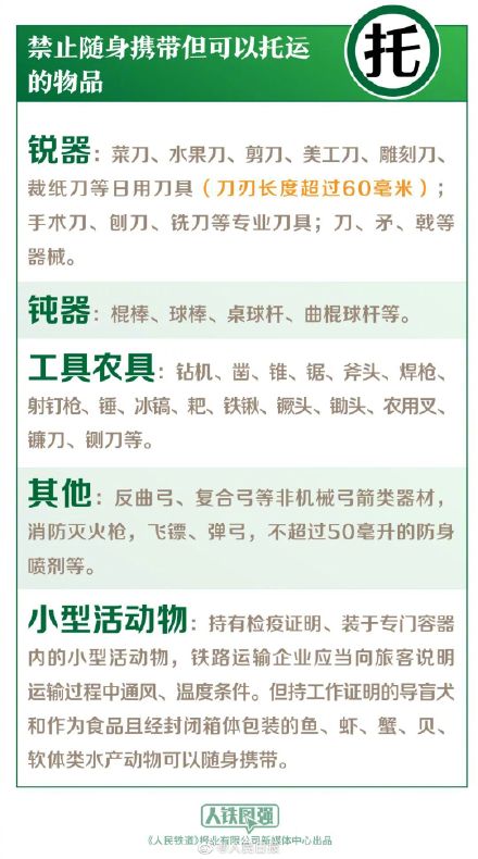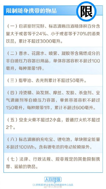 最新版《铁路旅客禁止、限制携带和托运物品目录》2022年7月1日起施行。新目录规定:①酒类饮品包装密封须完好、标志清晰,24%≤酒精浓度≤70%范围内,累计携带量不能超过3000毫升;②明起坐火车带充电宝有容量限制:单块额定能量不超过100Wh…(中国铁路)